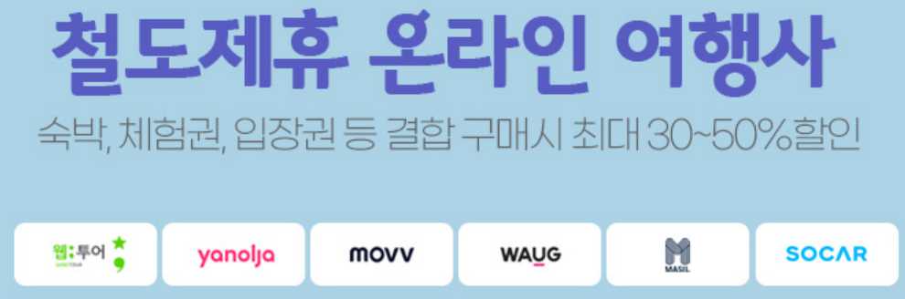 - 행사기간 : 구매일 기준 - 5월 24일 (수) ~ 6월 30일 (금)/ 승차일 기준 - 6월 1일 (목) ~ 7월 16일 (일) (단, 바다열차는 승차일 기준 6월 30일 (금) 까지만 적용)